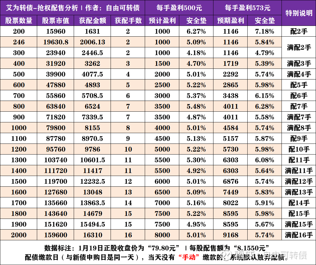 艾为转债-配债计算 每股配售额:8.1550元 获配金额:股票数量×每股配售额 安全垫:预期盈利÷股票市值
