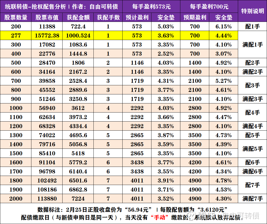 统联转债-配债计算 每股配售额:3.6120元 获配金额:股票数量×每股配售额 安全垫:预期盈利÷股票市值