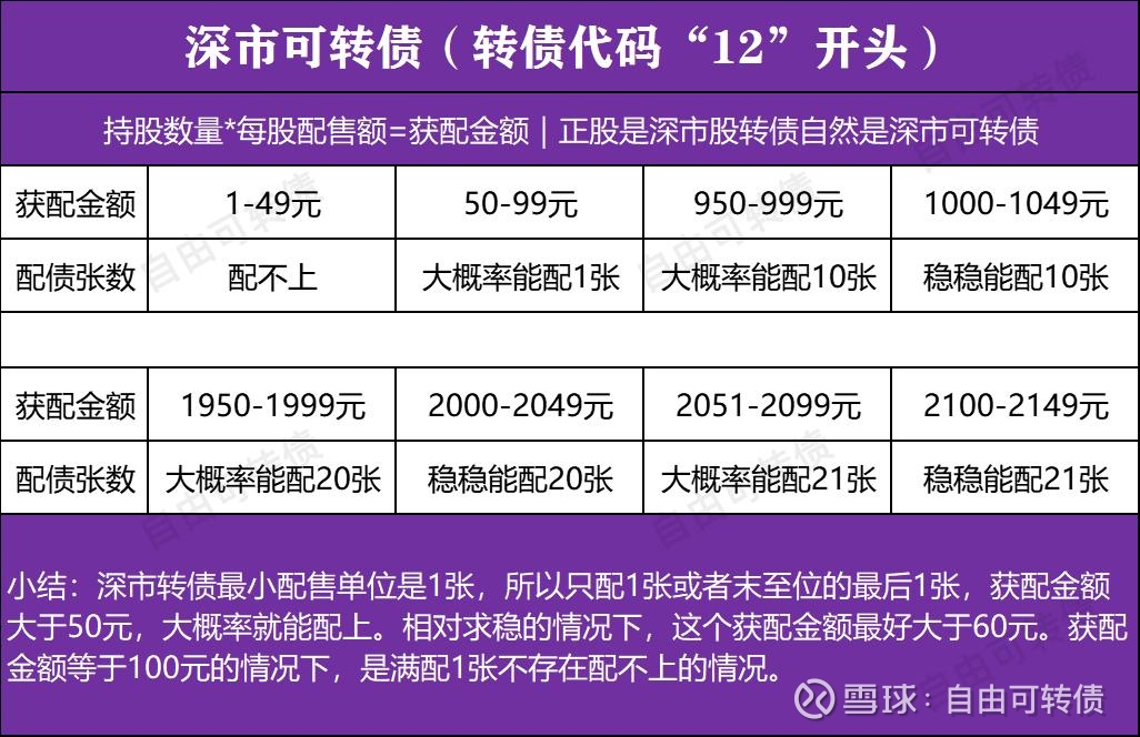 深市可转债:获配金额每满100元就能获配1张转债。只配1张转债和末置位的最后1张转债,获配金额大于50元大概率就能配上。例如获配金额950元,大概率能配上10张转债,其中9张是稳稳的能配上,末置位的最后1张有概率配不上。想要稳稳的获配10张转债,获配金额最好大于等于1000元。