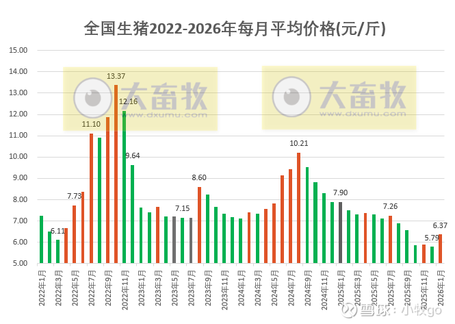 根据每日猪价计算,2026年1月平均猪价为6.37元/斤,环比上涨0.58元,涨幅为10.02%,由跌转涨,时隔3个月再次突破6元大关,为近4个月最高价;