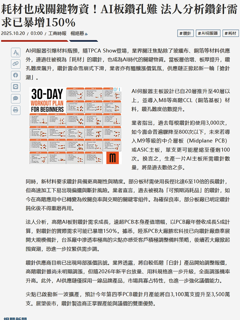 AI服务器主板层数增加(从20层升至40层以上)、材料升级(如M8/M9基板),导致钻针寿命从3000次骤降至800次以下(未来或仅100次),需求暴增150%。