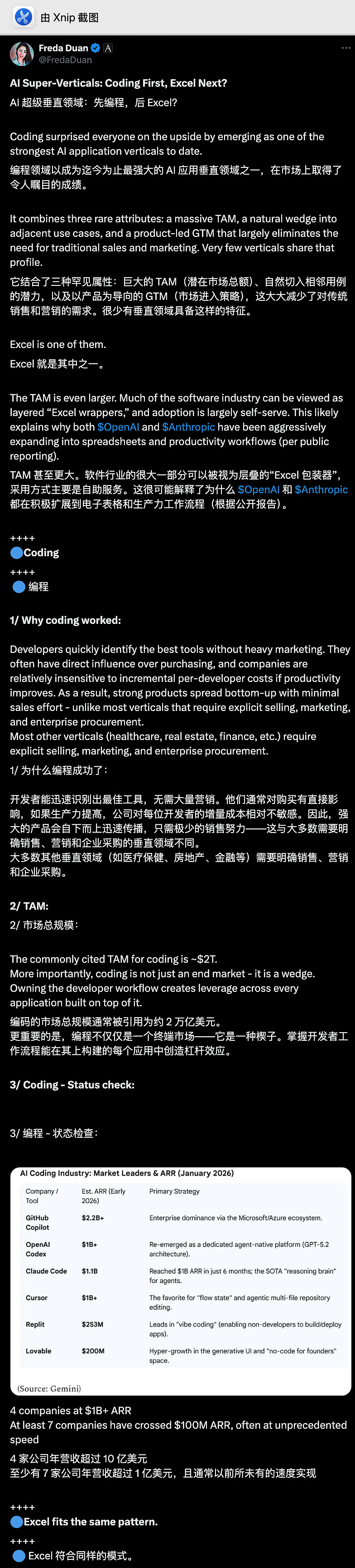 TAM 甚至更大。软件行业的很大一部分可以被视为层叠的“Excel 包装器”,采用方式主要是自助服务。这很可能解释了为什么 $OpenAI 和 $Anthropic 都在积极扩展到电子表格和生产力工作流程(根据公开报告)。