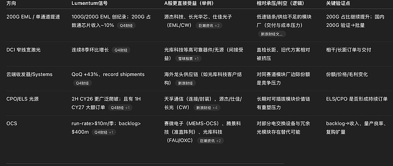 OCS(run-rate + backlog):利好 MEMS/高端无源阵列/FAU等关键部件链条(A股映射最清楚);相对利空在于部分电交换/冗余链路的资本开支可能被分流。(Q4财经)