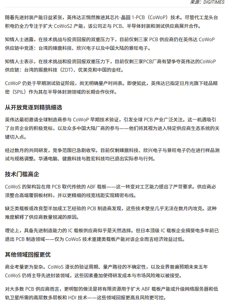 知情人士表示,在技术挑战和投资回报双重压力下,目前仅剩三家PCB厂商有望争夺英伟达的CoWoP供应链:台湾的振鼎科技(ZDT)、优美克和中国的金旺。