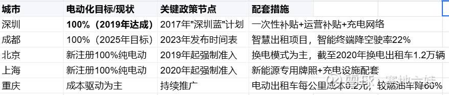 出租车市场的电动化路径与网约车有所不同,呈现"政策强制先行、成本优势巩固"的特征。主要城市的进展展示了这一进程的广度和深度: