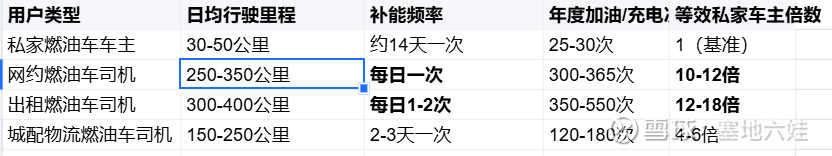 核心发现:单个网约车司机的年度补能次数约为私家车主的12-14倍,出租车司机更高达15-18倍。这一倍数差异意味着,高频用车群体的电动化替代对加油站销量的冲击被显著放大——每1辆运营车辆电动化,等效于10-18倍规模的私家车市场从加油站网络退出。而网约车、出租车保有量虽仅为私家车保有量的3%-5%,但其等效替代效应却可达30%-70%。
