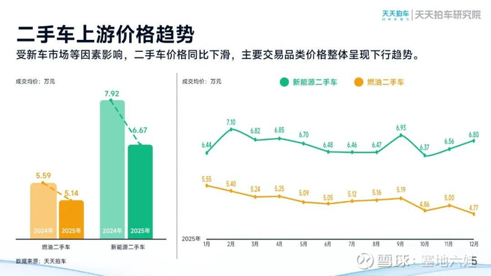 拍卖市场信号:二手车拍卖平台的成交数据是残值率的先行指标。2024年以来,燃油车拍卖成交率下降、流拍率上升,价格中枢持续下移。2025年燃油二手车成交均价从2024年的5.59万元降至5.14万元,同比下降8.1%;更危险的是月度趋势,2025年1月成交均价5.55万元,12月已跌至4.77万元,全年跌幅达14.1%。