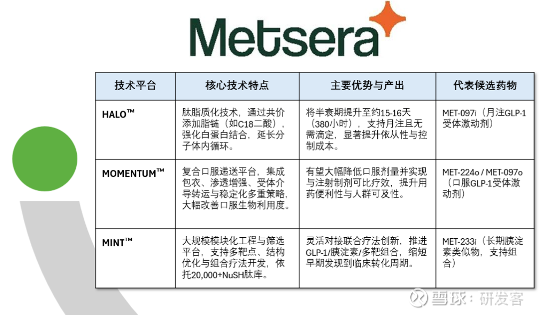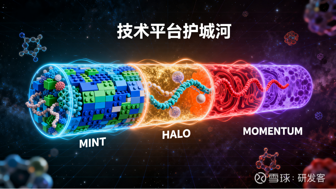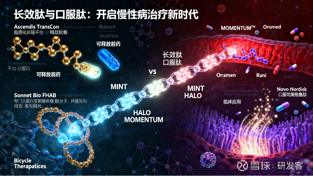 ·三大技术平台奠基,MINT肽库实现模块化候选分子设计,HALO延长半衰期支持月剂量给药,MOMENTUM口服递送平台提升生物利用度。