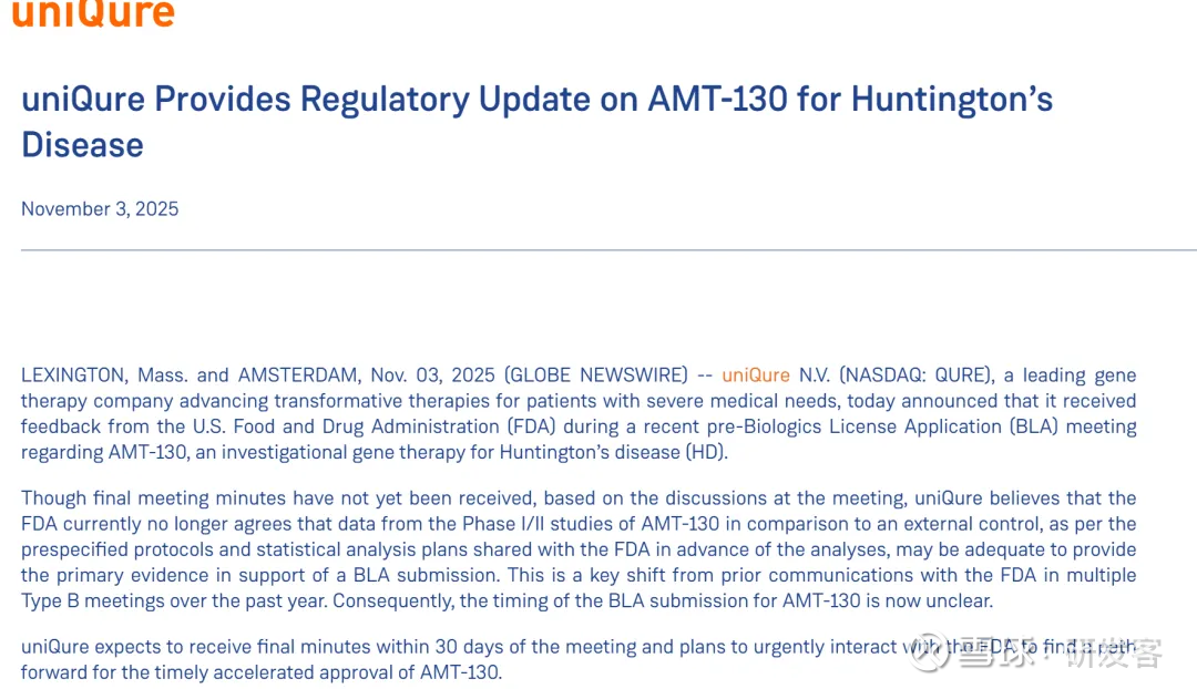 uniQure也在同一天遭遇打击。该公司表示,FDA已暗示可能不会接受其针对亨廷顿舞蹈症基因疗法 AMT-130 早期试验数据作为上市申请的基础。这一消息导致11月3日盘前交易中,uniQure的股价下跌68%。