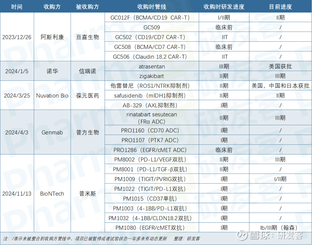 值得一提的是,在本次分析的样本中,信瑞诺是唯一一家被收购后管线得到完整保留的公司,仅有的2款产品均被诺华接纳且进展顺利。