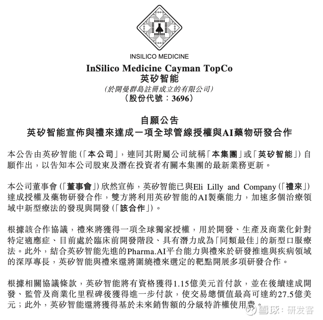 就在3月29日晚8点,礼来还与英矽智能达成27.5亿美元的合作。礼来获得由英矽智能的AI技术开发的一款GLP-1降糖药的独家销售权,首付款为1.15亿美元,总金额将高达27.5亿美元。