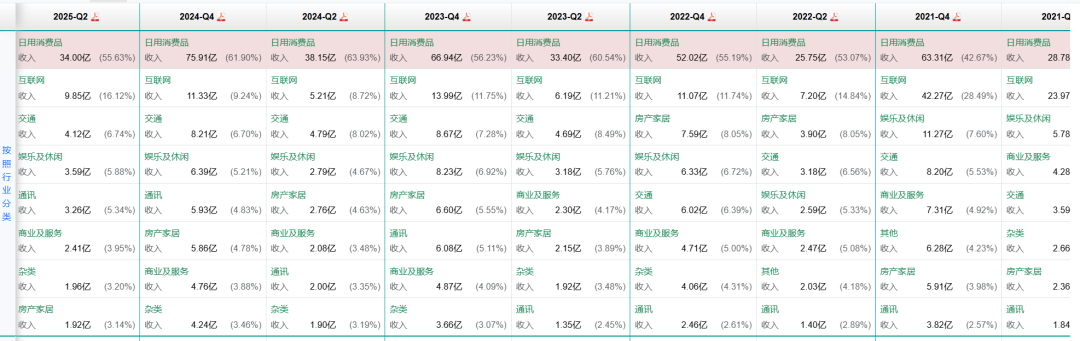 21年总营收148.4亿,日用消费品63.3亿、互联网42.3亿,二者合计贡献了71.16%的营收。24年总营收115.5亿,日用消费品71.9亿、互联网11.3亿,二者合计贡献了71.14%的营收。