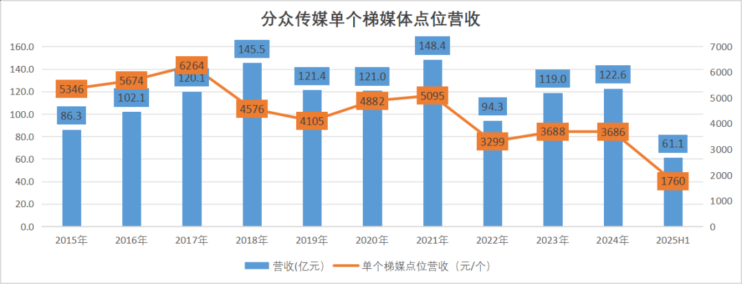 公司单点营收的高位是2017年的6264元/个,而近两三年仅为3000多元/个。随着这几年点位数量扩张至300万个(2017年为150万个),单点营收要想回到6000多,难度很大。