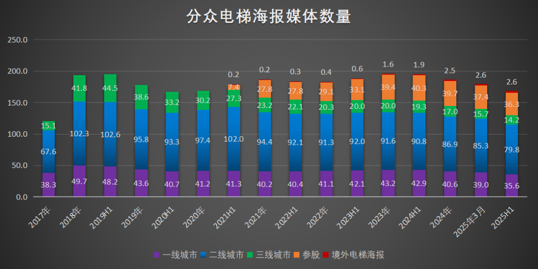 之前媒体点位的变化趋势是朝一二线、电梯电视倾斜,缩减三四线点位、电梯海报的数量,但总数量还在小幅增长。这种趋势一直持续到2024H1,到24年年报至本次半年报开始有了新的变化:点位结构上依然在向电梯电视倾斜,点位数量上一二三线城市都开始收缩(仅电梯电视小幅增长,电梯海报大幅下滑),总数量已经开始下滑。见下图: