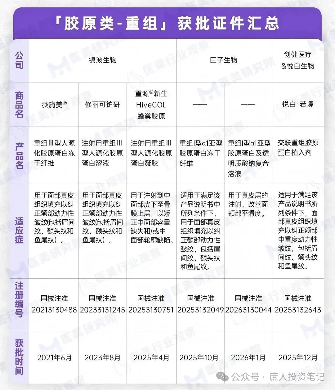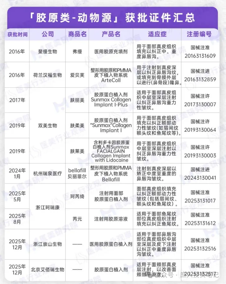 比如,好多业内人士都认为胶原蛋白的产品终端需求非常强烈,短期内没有太多的替代品,26/27年会是胶原蛋白的大年。在我看到的另一面是最近批证的速度非常快。不仅是胶原蛋白,微球再生材料也是。