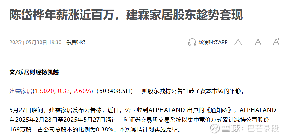 2025年5月,减持完成,公告显示实际减持169万股,均价13.47,套现2275万元,减持完成率38%,阿尔法仍然持股超过6%,减持股份相对于其3100多万持股来说只是个零头。以此推断,大股东减持原因第二种可能性较小。那么实际上,这个点位,建霖价格到底高不高?后边有机会单列一篇讲讲。