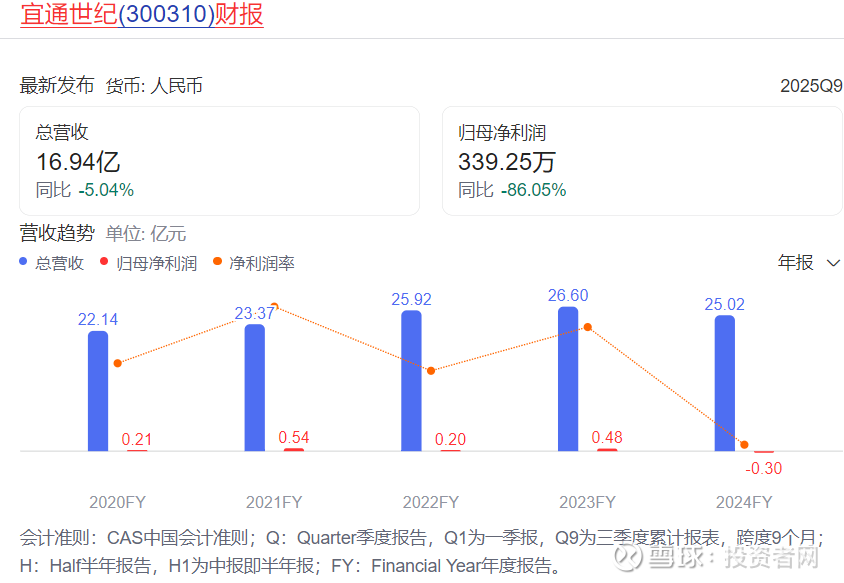 2025年前三季度,宜通世纪实现营收16.9亿元,同比下降5%;归母净利润339万元,同比下降86.1%。