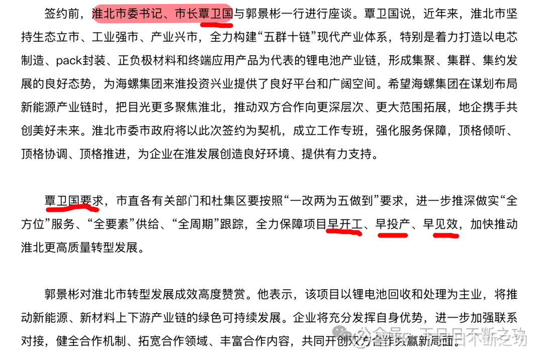 海创在淮北的锂电回收项目建设迟缓,可能会因为苏高新项目先行投产而取消建设。