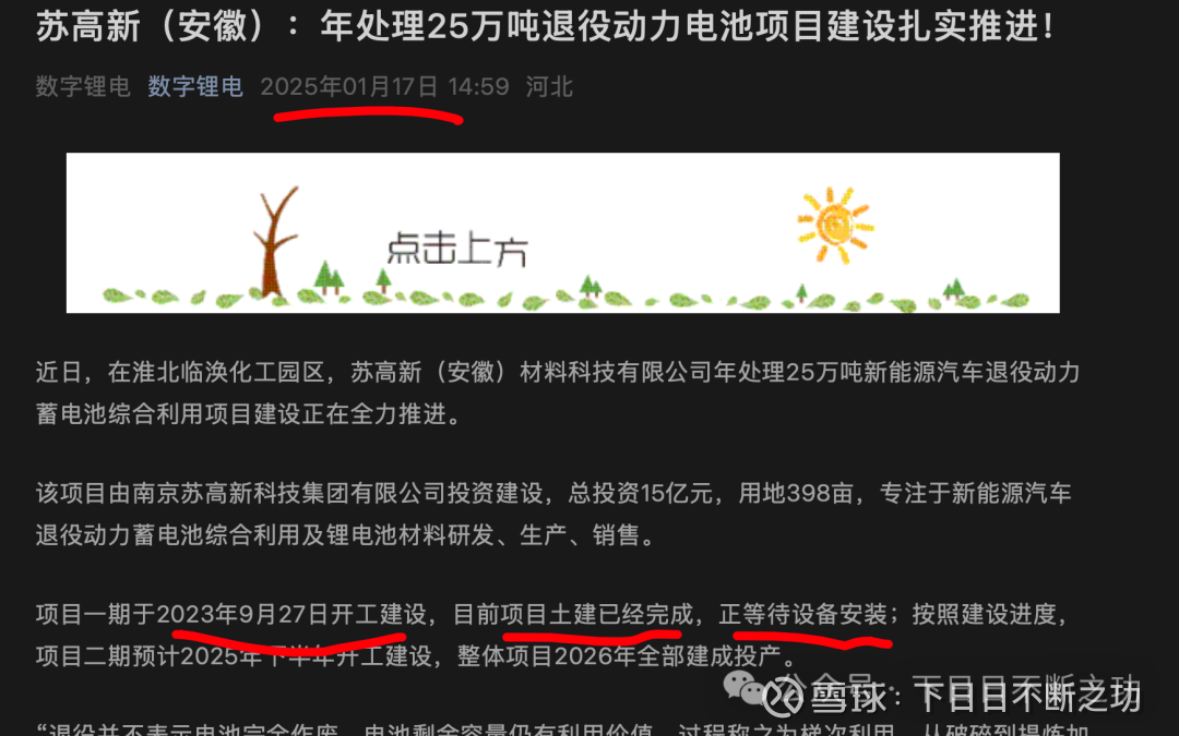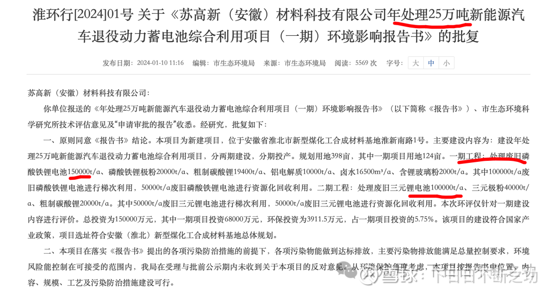 接下来,为确认此项目建设到什么进度,查询了开工必须的环境影响报告书的时候,没找到海创这个项目的,却意外看到了另外一个大项目: 苏高新(安徽)材料科技有限公司年处理25万吨新能源汽车退役动力蓄电池综合利用项目。