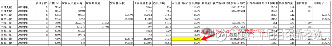 对比了这两年中报的垃圾发电运营数据,同时把之前的同行的数据拉出来一起对比: