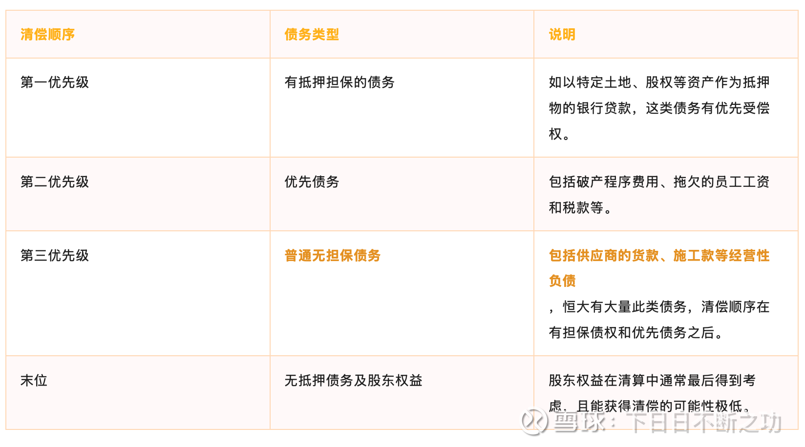 下面是主要的债务清偿顺序表格,根据此表,海螺的债权在清偿中优先等级较低,追回的前景不太乐观:
