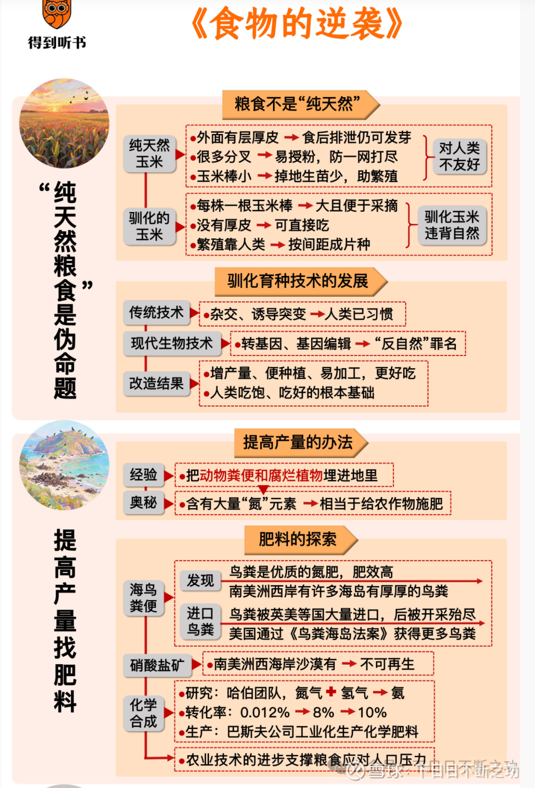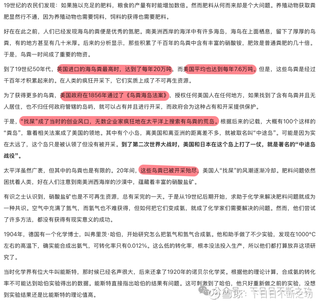 这本书名《食物的逆袭》,来自于得到平台。书籍本身讲的是食物有关的知识,不过其中有一部分关于氮肥由来的经历,完美地展示了一种资源从没有价值--〉很有价值--〉失去价值的过程。