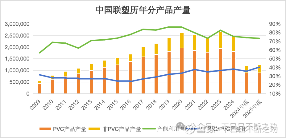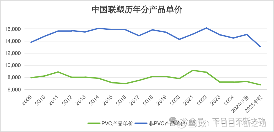 价格自2022年来时就是单边下跌,PVC产品和非PVC产品都是如此,25年中报相比24年更是剧烈下降。 价跌 无疑了。