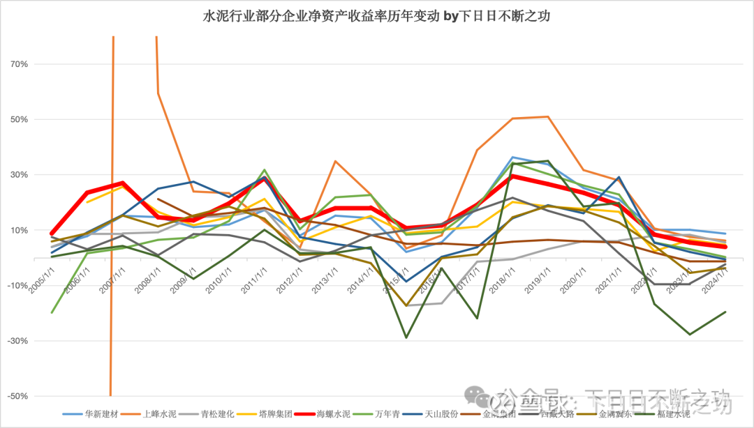 把A股上市的水泥企业的历年净资产收益率拉出来,直观体验行业波动: