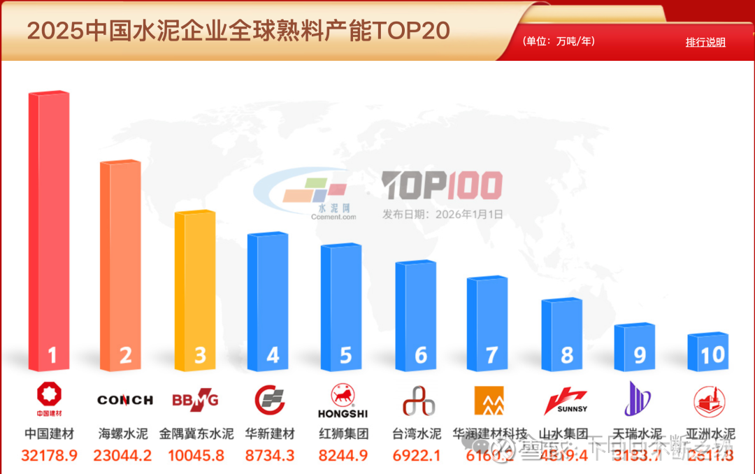 水泥网发布了一年一度年中国水泥企业全球熟料产能数据,中国建材以3.2亿吨每年的成绩继续保持产能冠军,海螺水泥2.3亿吨排名第二,其后是金隅冀东、华新建材等等,产能差距就很大了。