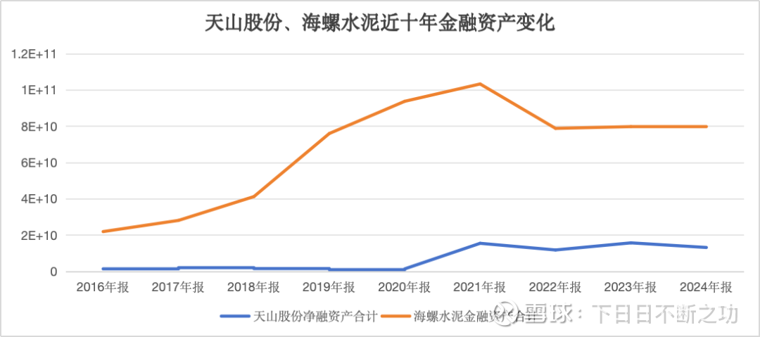 天山股份在2021年的时候,金融资产有了大幅增加。估计是因为中建材并购的影响,不再做查证了。如此只对比21年之后的数据即可。