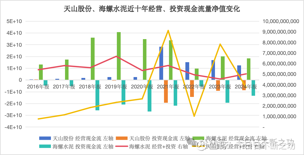 无论是经营性现金流,还是投资性现金流,历年海螺的规模基本上大于天山股份,唯有2022年例外。22年发生了什么?疫情吗?这是