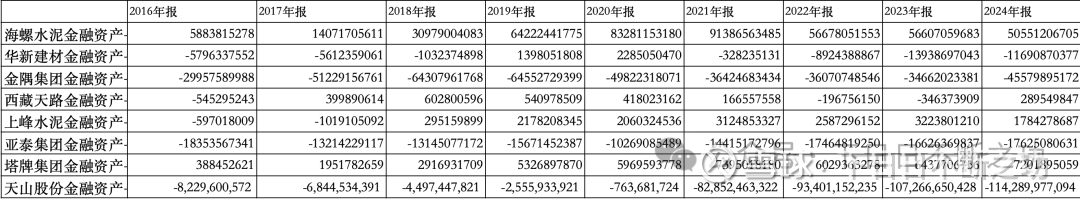 海螺水泥、西藏天路、塔牌集团、上峰水泥四家金融资产为正;华新建材、金隅集团、亚泰集团、天山股份为负