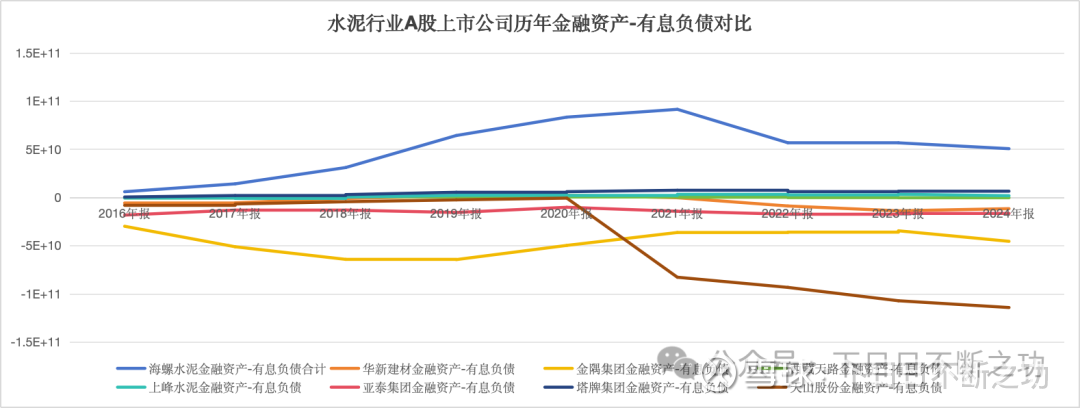海螺资金实力遥遥领先,有500亿金融资产;天山最差,1100亿的金融负债(昨天的报告看错了位数,以为是百亿负债,其实是千亿)
