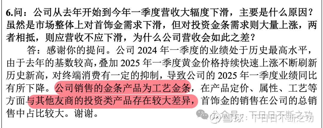公司在业绩说明会上,对营收大幅下滑做出了解释。在其中,把投资金条单独点了出来:公司销售的金条产品为工艺金条,在产品定价、属性、工艺等方面,与其他友商的投资类产品存在较大差异。