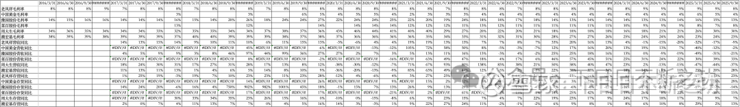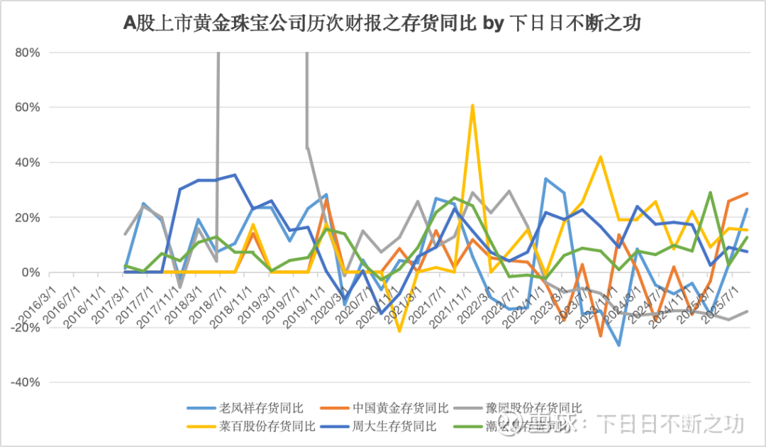 昨天通过毛利率、营收同比、存货同比观察,认为老凤祥处于库存周期的“滞涨/衰退初期”,也有可能是”衰退后期“。今天我们再看看行业内的其他公司,确认周期阶段是否一致。