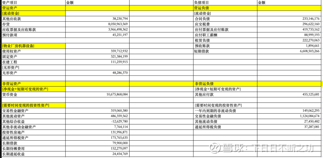 这次用AI写了程序,根据每个科目打上的运营资产/非营运资产、资产/负债,以及各小分类的标签,自动输出了资产负债表个重构版,非常方便: