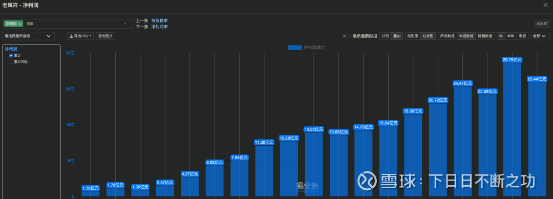 老凤祥上市以来,净利润一直以较高的斜率在增长。如下图数据,保守估计,每年22亿的净利润应该是完全没问题的。