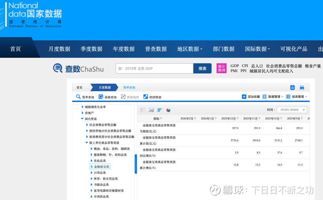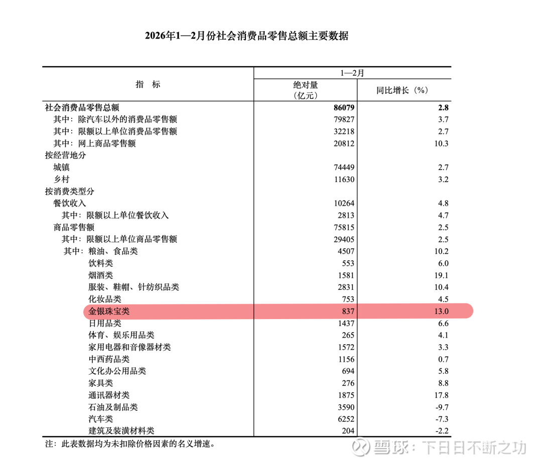 下面是当期的数据截图,从中可知,26年1-2月全国金银珠宝类零售总额837亿元,同比增长13%!这个数据我比较意外,体感经济不好消费不振,没想到统计数据竟然增长这么多。不止珠宝类,服装、烟酒、通信器材等等也是高增长。只不过汽车、建筑装潢、石油等是萎缩的。