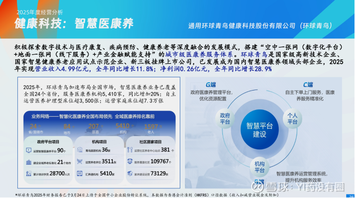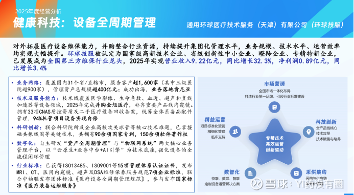 其中,医疗设备全周期管理业务收入 9.22 亿元,同比增长 32.3%,服务客户超 1,600 家,管理资产超 400 亿元,94% 托管项目设备实现自修;智慧医康养业务全年实现收入 4.99 亿元,增长 11.8%,净利润 0.26 亿元,增长 28.9%,覆盖全国 24 个省份,服务医康养机构 5,410 家,运营家庭床位超 7.3 万张。此外,公司还进一步拓展智慧后勤、健康数智科技等业务,加快构建健康科技核心能力。