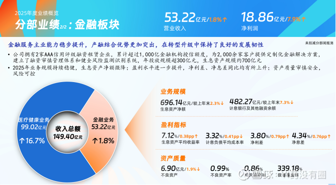 由上可见,金融业务在转型升级中保持了良好的发展韧性,通过聚焦主责主业、优化投放结构、创新服务模式,既实现了自身稳健增长,又为医疗健康等核心业务提供了有力支撑。产融结合的深度拓展,进一步提升了金融业务的附加值与竞争力,也推动公司形成 “金融赋能产业、产业反哺金融” 的良性循环,为上市公司的高质量发展提供了坚实保障。