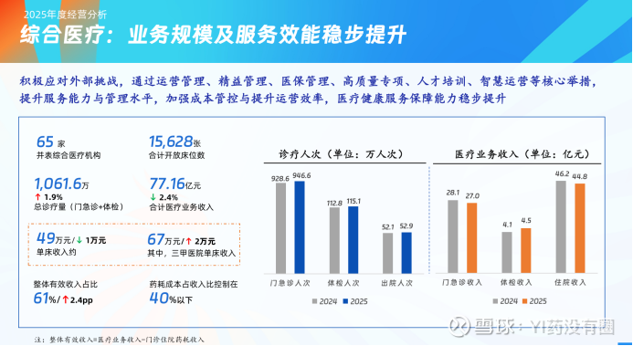 面对外部压力,公司主动调整运营策略。在加强医保精细化管理、优化病种结构、聚焦高价值诊疗服务的同时,通过精益运营压缩成本,在保障服务质量的前提下力求减少医保支付压力。2025 年,公司整体医疗机构有效收入占比提升至 61%,同比增长 2.4 个百分点,药耗成本占比控制在 40% 以下,有效对冲了外部经营压力,保持了经营基本面稳定。