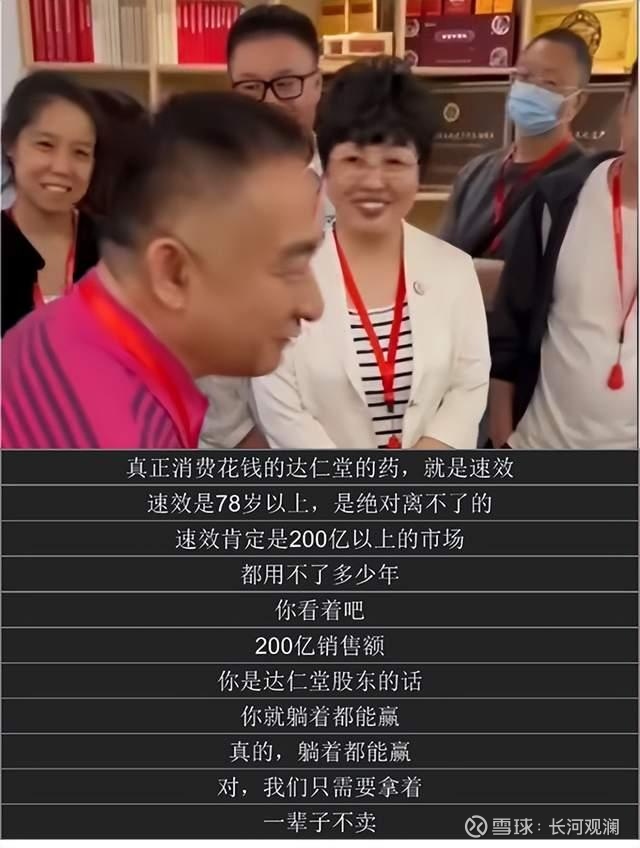 最近半年,林园参加达仁堂股东大会的一些视频片段在网上流传很广。其中一个视频,林园说他母亲87岁之前没吃过速效,现在去哪都得带着。林园毫不吝啬对这个药的欣赏:“速效救心丸真的是个好药……速效肯定是200亿以上的市场,都用不了多少年……你是达仁堂股东的话,你就躺着都能赢。”