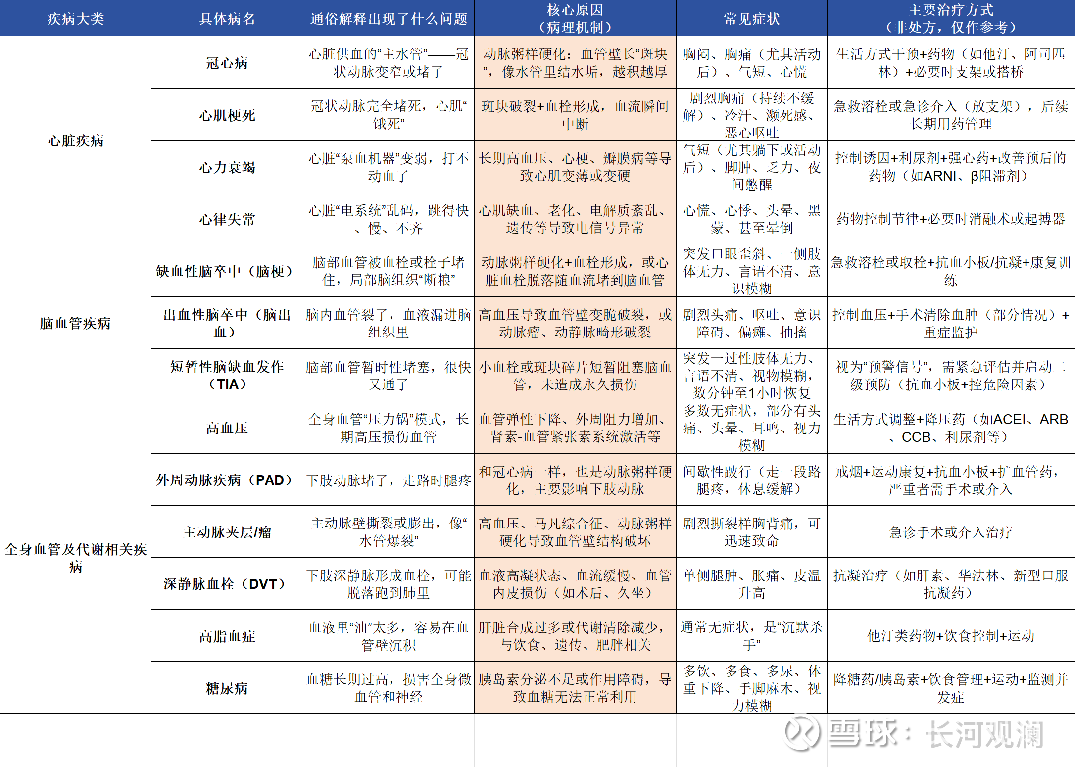 1)动脉血管生锈、变窄:血液里的胆固醇等物质像水垢一样沉积在血管壁,形成“粥样斑块”,让血管变硬、变窄,这个过程就是动脉粥样硬化。它是绝大多数心脑血管疾病的共同病理基础。