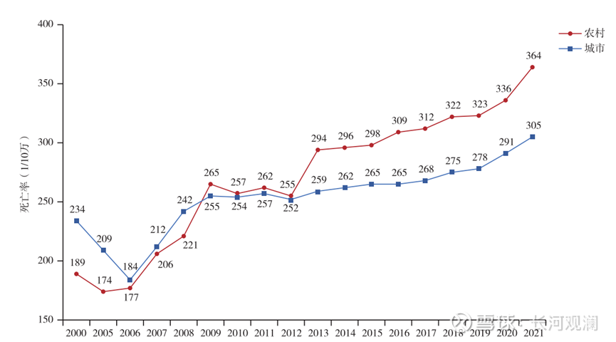 【图表】2000-2021年中国城乡居民心血管疾病死亡率变化(来源:《中国心血管健康与疾病报告》)