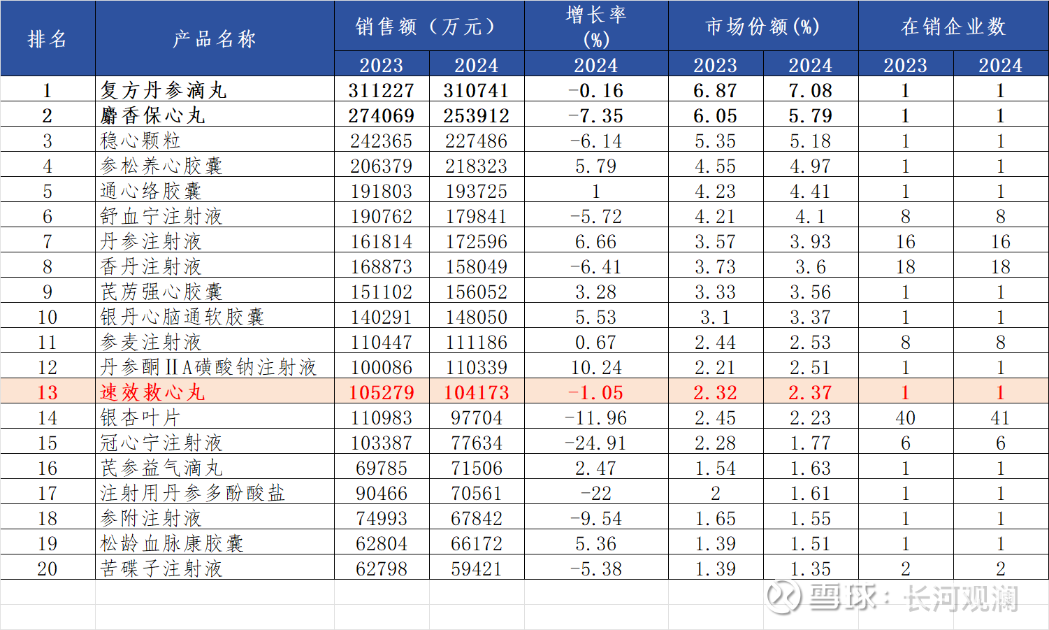 这个市场头部产品优势并不绝对,排名第一的复方丹参滴丸份额也仅为7.08%,前四名加起来份额才23.02%,属于典型的“低集中度竞争市场”。在这里,速效需要面对复方丹参滴丸、麝香保心丸、稳心颗粒等多个强劲对手的正面竞争。