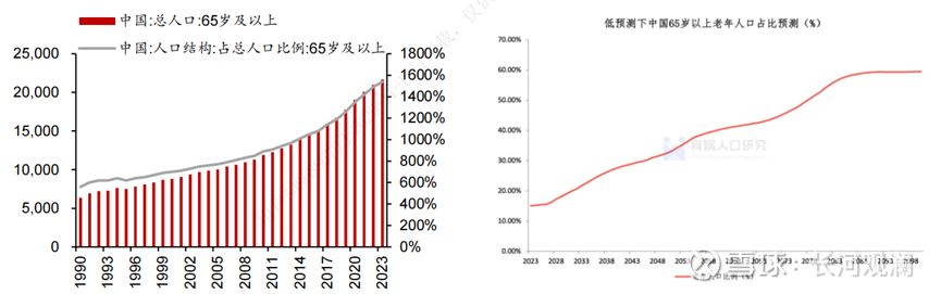 【图表】1990-2023 年中国 65 岁人口数量和占比,及中国 65 岁以上人口占比预测(来源:Wind,国联证券研究所)