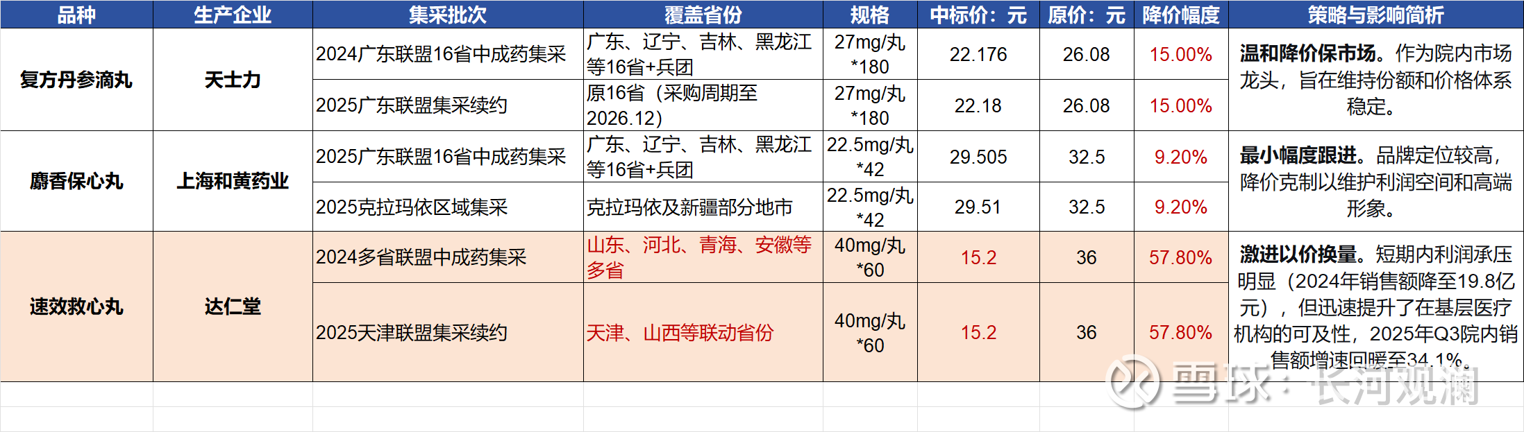 与竞品相比,其降价力度远超行业平均水平,速效救心丸因公立医疗端市占率不及复方丹参滴丸和麝香保心丸,而通过集采快速扩大了基层市场覆盖。