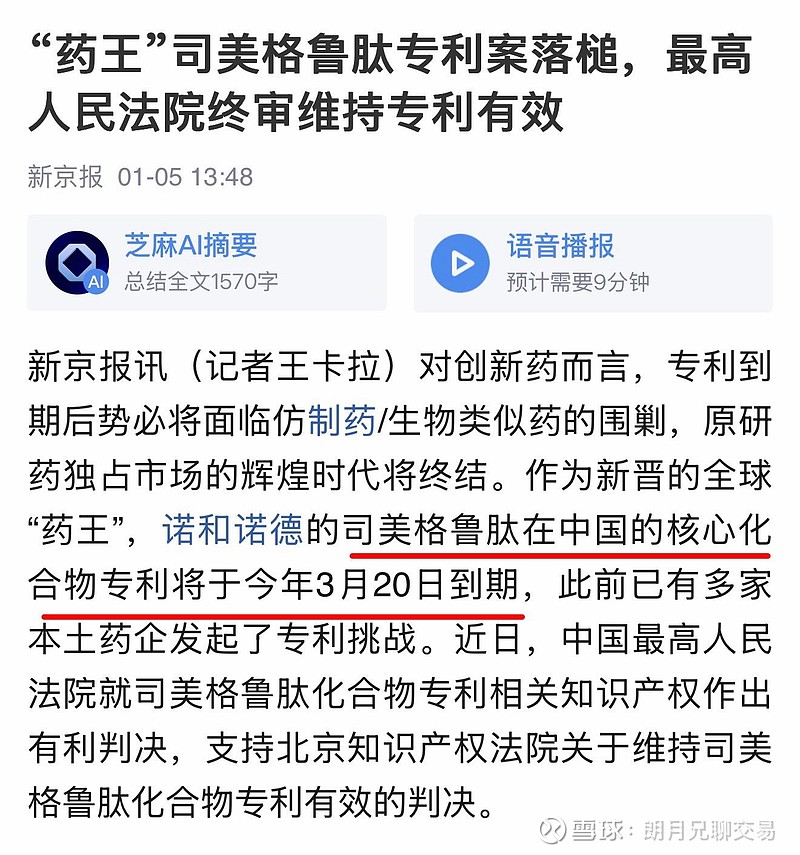 司美格鲁肽是当前全球最火的减肥+降糖药物,属于GLP-1赛道核心品种。但大多数人只盯着诺和诺德,却忽略了一个更底层的逻辑:所有制剂企业,无论是谁做仿制药,都绕不开一个东西——多肽原料药。换句话说,谁掌握了原料药,谁就掌握了产业链的“水龙头”。而中国市场专利一旦到期,最先爆发的不是品牌药,而是:仿制药 + 原料药需求。