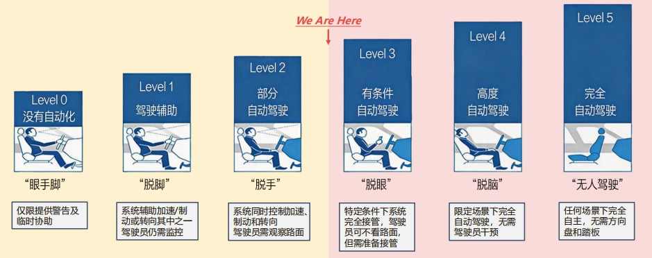 目前行业处于L2辅助驾驶阶段,从L2到L3有一个非常重要的变化,即驾驶责任转移,由原来的驾驶员承担转为系统承担。