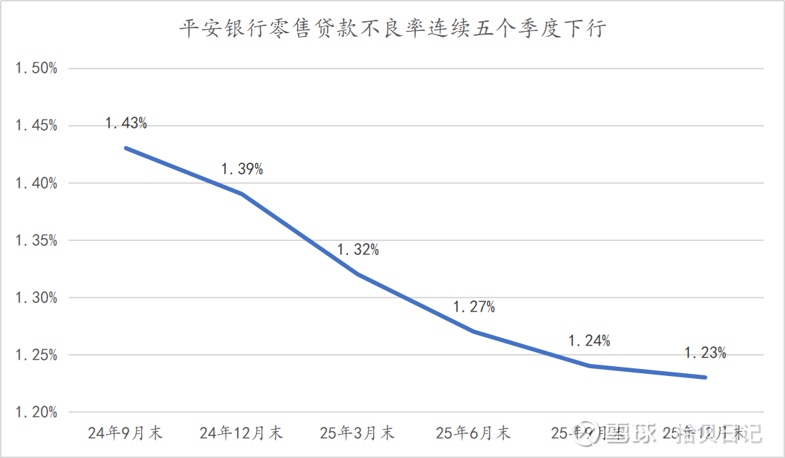 在这样的背景下,2025年末,平安银行零售贷款整体不良率已降至1.23%,从季度数据看,已连续5个季度保持下行,期间降幅已高达0.2个百分点。这无疑标志着平安银行零售资产质量的“安全垫”已大幅夯实。